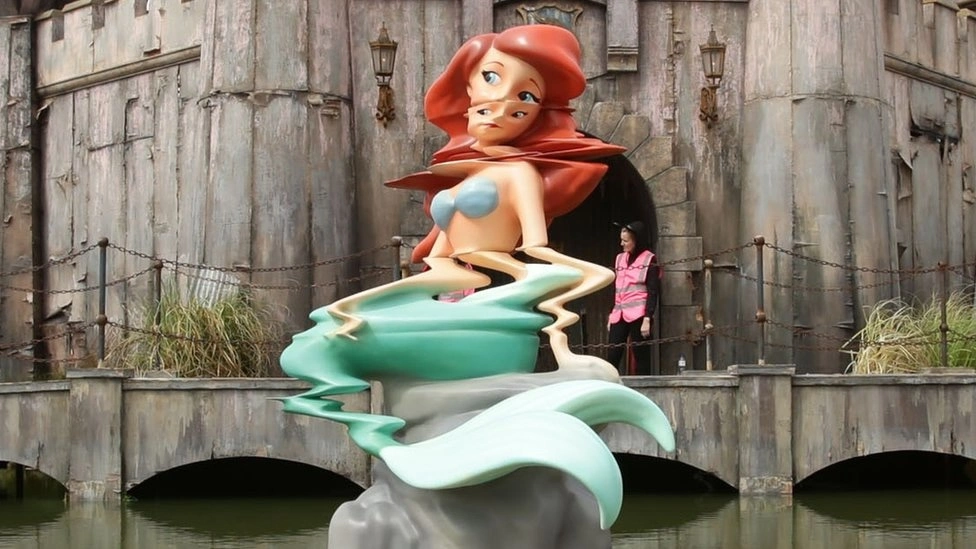 Parkta masum çocukları taşıyan ve denize açıldığında batacağını bildiğimiz mülteci botu, kazaya kurban giderek masaldaki şansı tersine dönen prensesler, bozulan ya da terkedilmiş oyuncaklar, tematik eğlence parklarında tercih edilmeyen bir renkte gri duvarlar, çürüyen masal figürleri vardır. Bunlar yalnızca birer “anti-Disney” simgesi değil, umut yitiminin estetik nesneleridir.